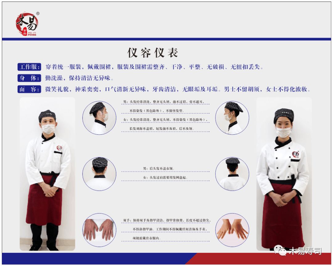 双手:保持双于及指甲清洁,指甲常修剪,长度不超过指尖,不得涂指甲油,工作 期间不得佩戴任何首饰及手表,项链需藏在衣服内。寿司加盟多少钱